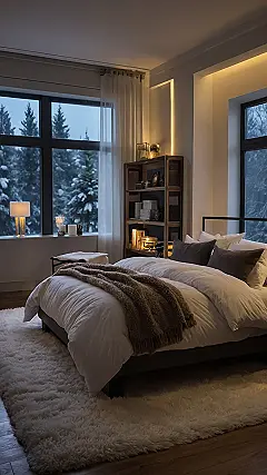 This bedroom is giving off serious winter vibes! It’s like stepping into a cozy cabin nestled in a snowy forest. The fluffy blanket looks like a cloud you could just sink into, and the soft lighting makes you feel warm and snug. Imagine curling up in this bed with a mug of hot cocoa and a good book, watching the snow fall outside. It’s the perfect place to escape the cold and relax for a while.