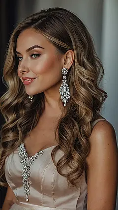 When you’re rocking a winter wedding, this look is your ticket to being the most glowing person in the room, whether you’re the bride or a super stylish guest. It’s all about looking fabulous without looking like you spent five hours trying – which, let’s be honest, is the ultimate goal for any fancy event. The way the light catches those shimmering locks and dazzling jewels? It’s like a sprinkle of actual winter magic fell right on you. Plus, with hair this gorgeous, you won’t even notice the frosty air, because you’ll be too busy feeling amazing and probably thinking about cake. Just remember to have fun with it, because confidence is the best accessory, even better than those killer earrings!