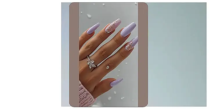 These nails are seriously cute! They’re like tiny, sparkly snowflakes found their way onto a super chic, lilac-colored canvas. Imagine walking into a winter wonderland, and BAM! These nails are the perfect accessory – glamorous enough for a holiday party but comfy enough to snuggle up by the fireplace with hot cocoa. They’re so detailed you almost expect a tiny snowman to pop out!