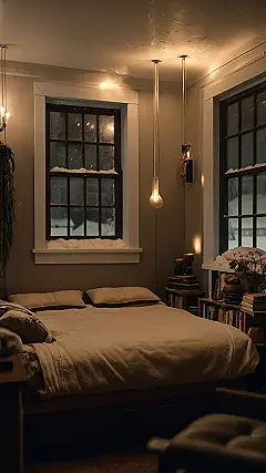 This picture is the definition of cozy! Just imagine being snuggled under those warm blankets, with a crackling fire in the fireplace (even though we can’t see it in the photo). The twinkling lights, the fluffy pillows, and the snow outside make you feel like you’re in a winter wonderland. And that candle in the lantern? That’s just the cherry on top, making the room feel like a magical escape from the cold. You could even add some fuzzy socks and a hot cup of cocoa for a truly perfect winter evening.