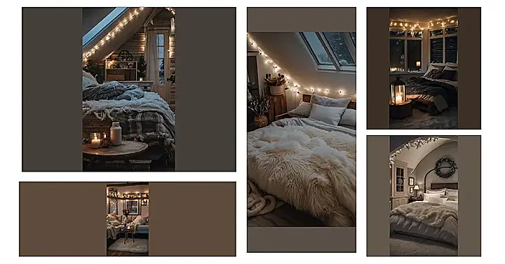 Imagine waking up to a snow-covered world outside your window. You pull back the fluffy blankets and see a breathtaking view of a snowy landscape. Youโre so snuggled up, you donโt even want to get out of bed! This room is perfect for those chilly winter days, where all you want to do is relax and unwind. Those twinkling lights make it feel like a magical winter scene straight out of a movie, and the soft, cozy textures invite you to spend the entire day snuggled up with a good book.