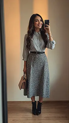 Striding into the concrete jungle for NYC Fashion Week 2025 doesn’t always mean wearing a dress made of recycled snack wrappers, thank goodness! This awesome look proves you can totally nail the scene without looking like you raided a costume shop. Our fashionista here, sporting a perfectly crisp striped shirt tucked into that cool patterned midi skirt, looks ready for anything – from front-row gossip to grabbing a quick coffee. Those chic black boots? Definitely for surviving miles of walking between shows, not just for looking fierce. She’s got that ‘I’m here to see the trends, but I *am* the trend’ vibe down pat.