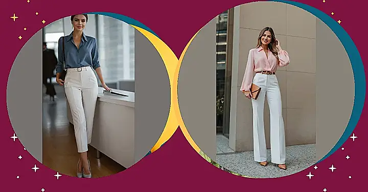 So how do you get that look without raiding your grandma’s closet? It’s easier than you think! Start with some killer high-waisted trousers like the white ones shown, they make your legs look miles long and instantly feel fancy. Then grab a simple, chic top in a classic colour, add some cool but not *too* flashy earrings, and boom – instant corporate glow-up achieved. It’s like putting together a puzzle, but the end result is you looking like you’re ready to slay presentations instead of just surviving Monday.