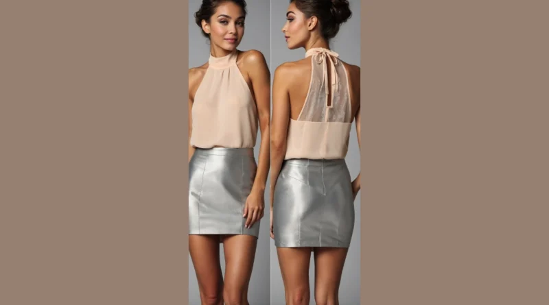 Now, if the top is your chic cloud, then the silver skirt is definitely your personal spaceship, ready for takeoff! Seriously, that metallic mini-skirt shines brighter than your future after acing that history test. It takes the soft elegance of the halter top and zaps it into a whole new dimension of cool, making you look like you just stepped off a runway – or maybe a glitter factory, in the best way possible. This whole look together? It’s not just an outfit; it’s a full-on confidence boost wrapped in shimmer and ready to make heads turn faster than a dropped phone during class!