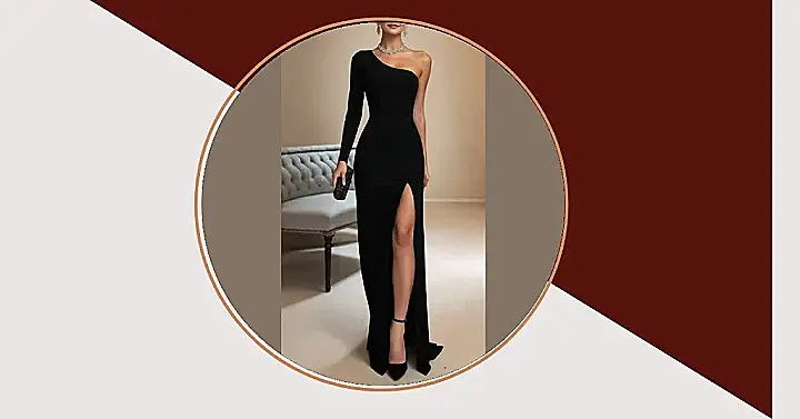 This sleek black dress, with its super cool one-shoulder design and that dramatic leg slit, is basically your VIP pass to looking absolutely stunning at homecoming. Forget the red carpet; you’ll be strutting into the school gym like it’s the most exclusive event of the year, probably causing a few jaws to drop (in a good way!). Paired with those sparkly accessories and a chic little clutch, you’re not just dressed for a dance; you’re ready to own the night and maybe even convince everyone you arrived in a fancy limo instead of your aunt’s minivan.