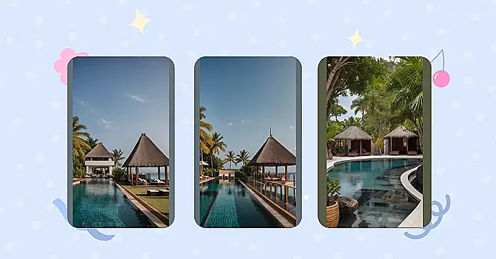 This tropical hotel looks so chill, it’s practically begging you to ditch your responsibilities and swan dive into vacation mode! Seriously, with that super cool thatched roof and those palm trees doing their swaying thing, it’s like the universe is saying, “Psst, your textbooks can wait.” The sky is so blue and the clouds look so perfectly puffy, you might actually wonder if someone painted them just for your Instagram story. It’s definitely a level-up from staring at your phone in a boring classroom – hello, real-life postcard!