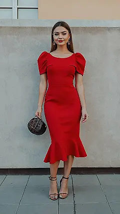 This red midi dress is basically a superhero costume disguised as formal wear! Seriously, you could walk into any room in this and instantly be the most stylish person there. The sleeves are puffed up like you’re ready to take on anything, and the little flounce at the bottom says, “Yeah, I saved the world, but I still look amazing doing it.”